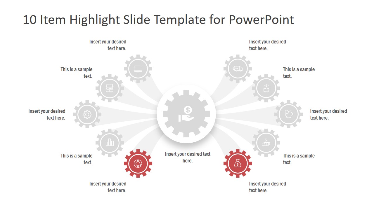 10项突出显示幻灯片PowerPoint模板是一种现代比较概念演示文稿。这是一个创造性的齿轮形图,中心元素两侧各有5个部分。它是比较两个独立实体或一种产品优缺点的理想工具。此外,颜色和剪贴画图标代表每个比较的特征。例如,讨论在商业中使用软件应用程序的功能和好处。这些信息图形包括桌面、列表、齿轮、条形图、油炸圈饼图、运输卡车、竖起大拇指、存钱罐、货币和钱袋。此外,所有项目的齿轮形状描述了一个完整系统中功能过程的分解。此外,中间的货币说明了整体呈现的财务概念