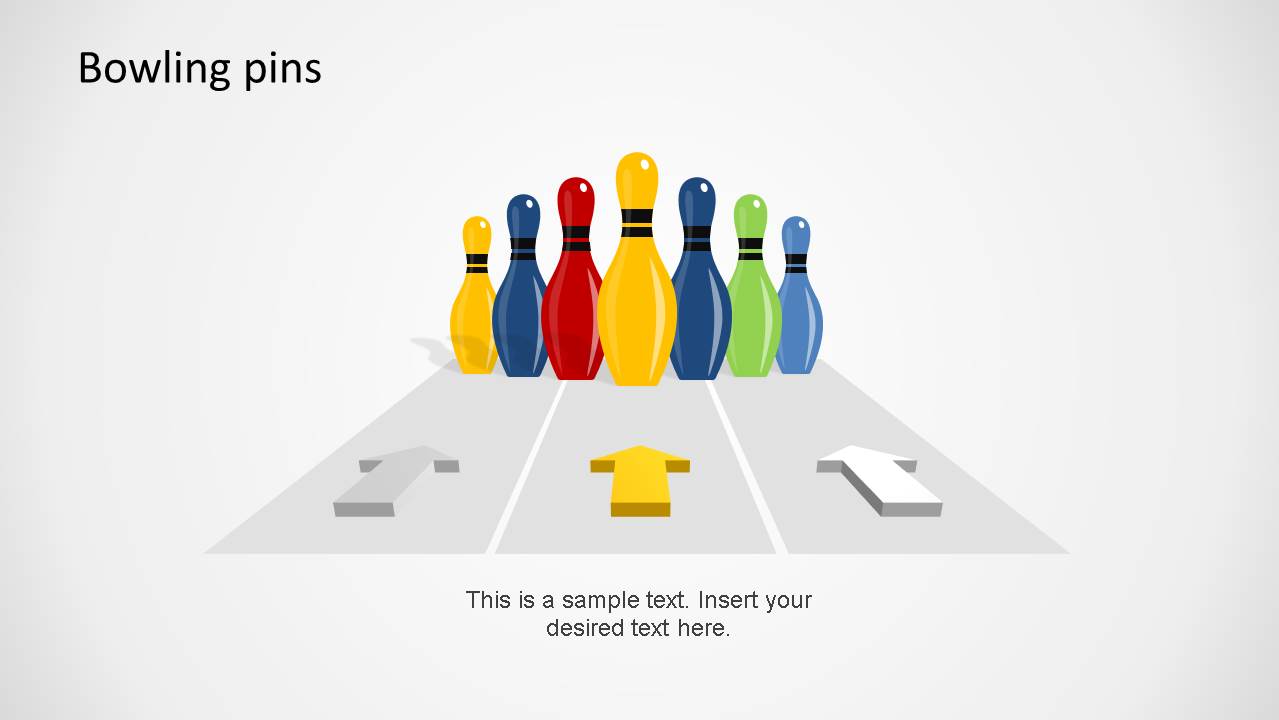 之后,一系列幻灯片显示了保龄球瓶的直接球道视图和保龄球碗的透视图,可以表示不同的目标和路径。我们结合小巷、图钉和箭头,突出显示不同的颜色,以显示一系列步骤